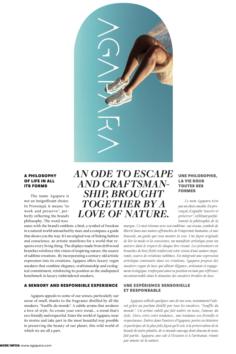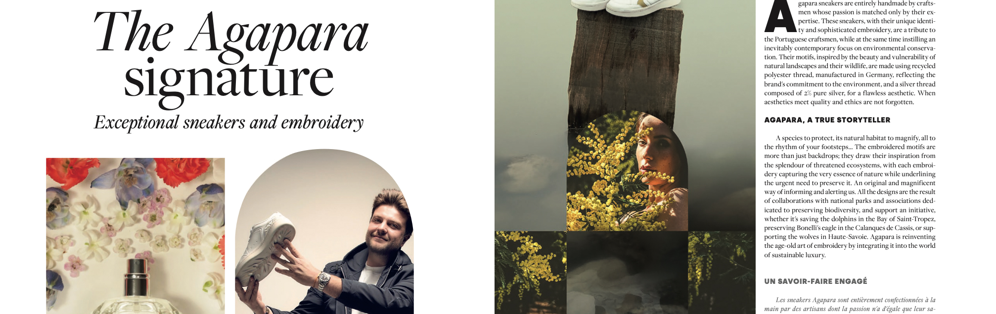 Dans les pages de l’édition Kube Saint-Tropez et de Blush Éditions (été 2025), Agapara dévoile un univers où style solaire rime avec engagement authentique. Ces publications mettent en lumière la signature élégante de la marque et ses sneakers homme et femme phares, dont la Tropéa T41, basket inspirée des célèbres Voiles de Saint-Tropez.