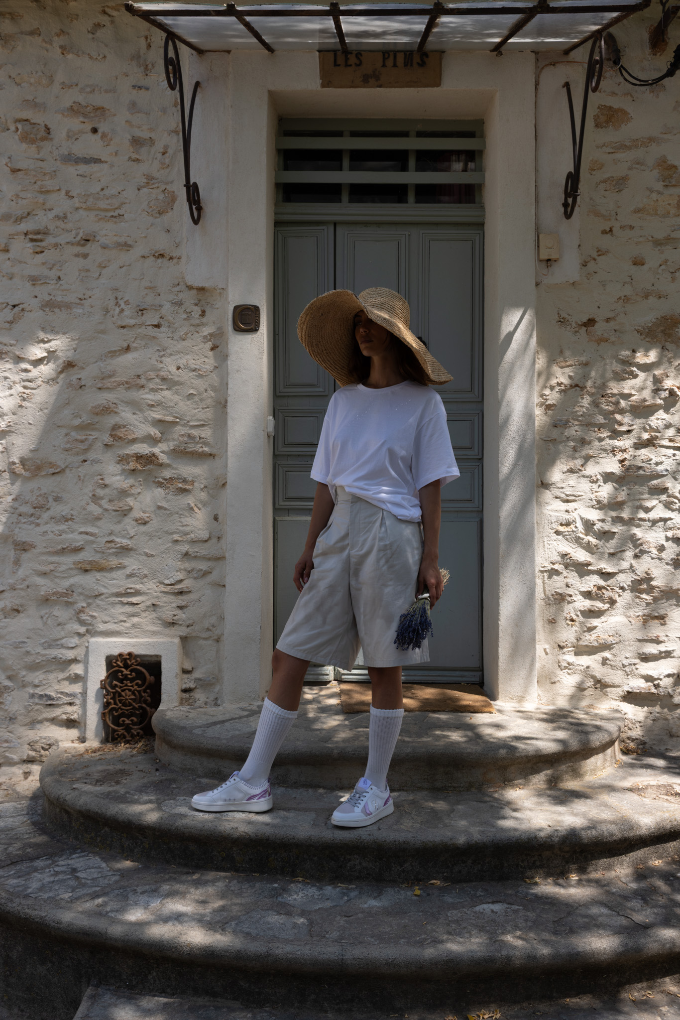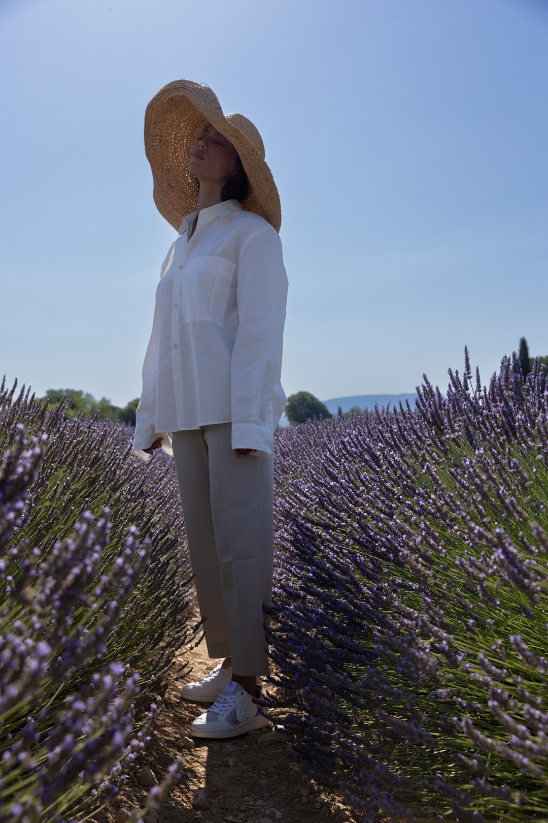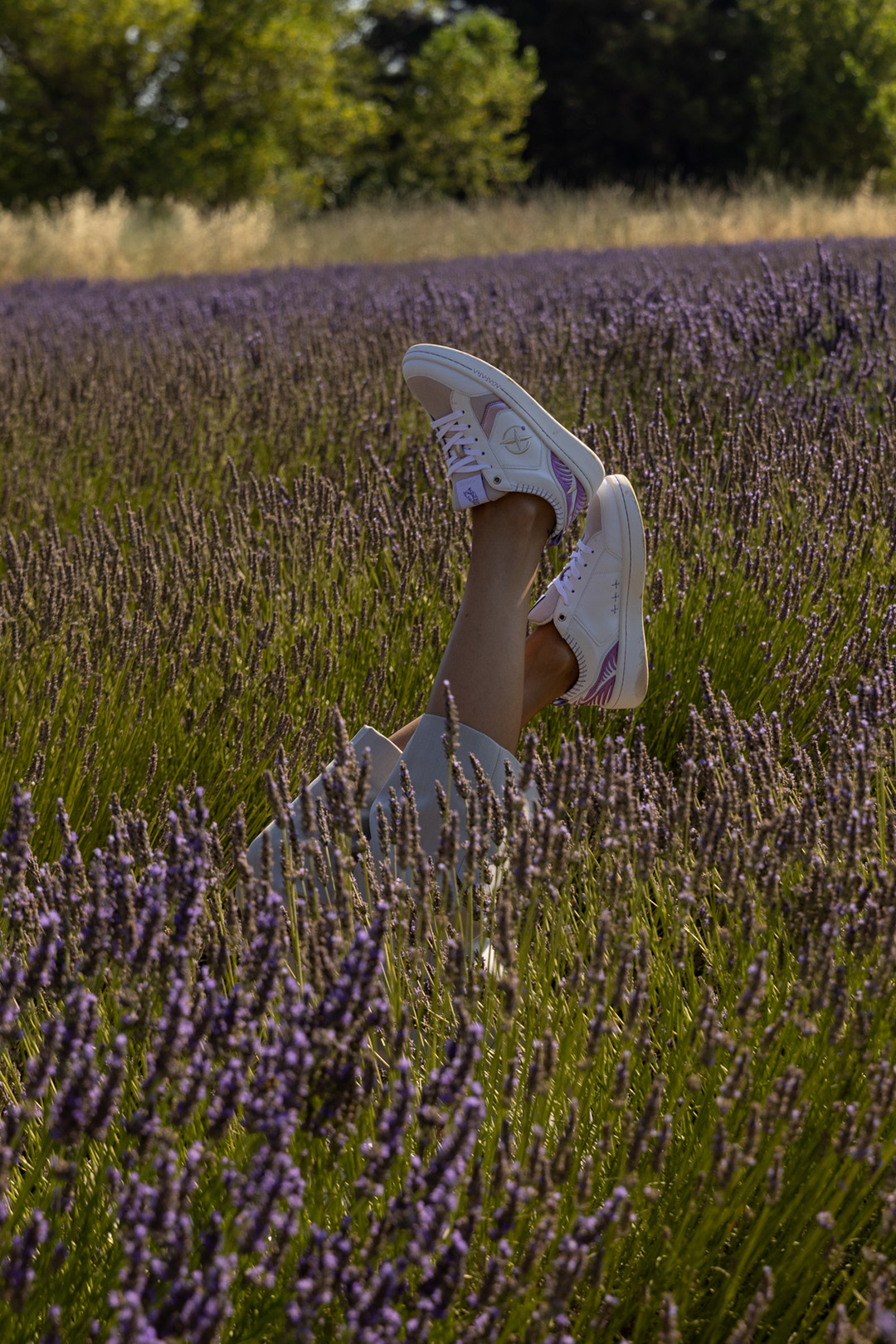 Sneaker artisanale inspirée par les champs de lavande de Valensole. Réalisée avec 39 198 points de broderie, elle soutient la préservation des chouettes chevêches de Provence.
