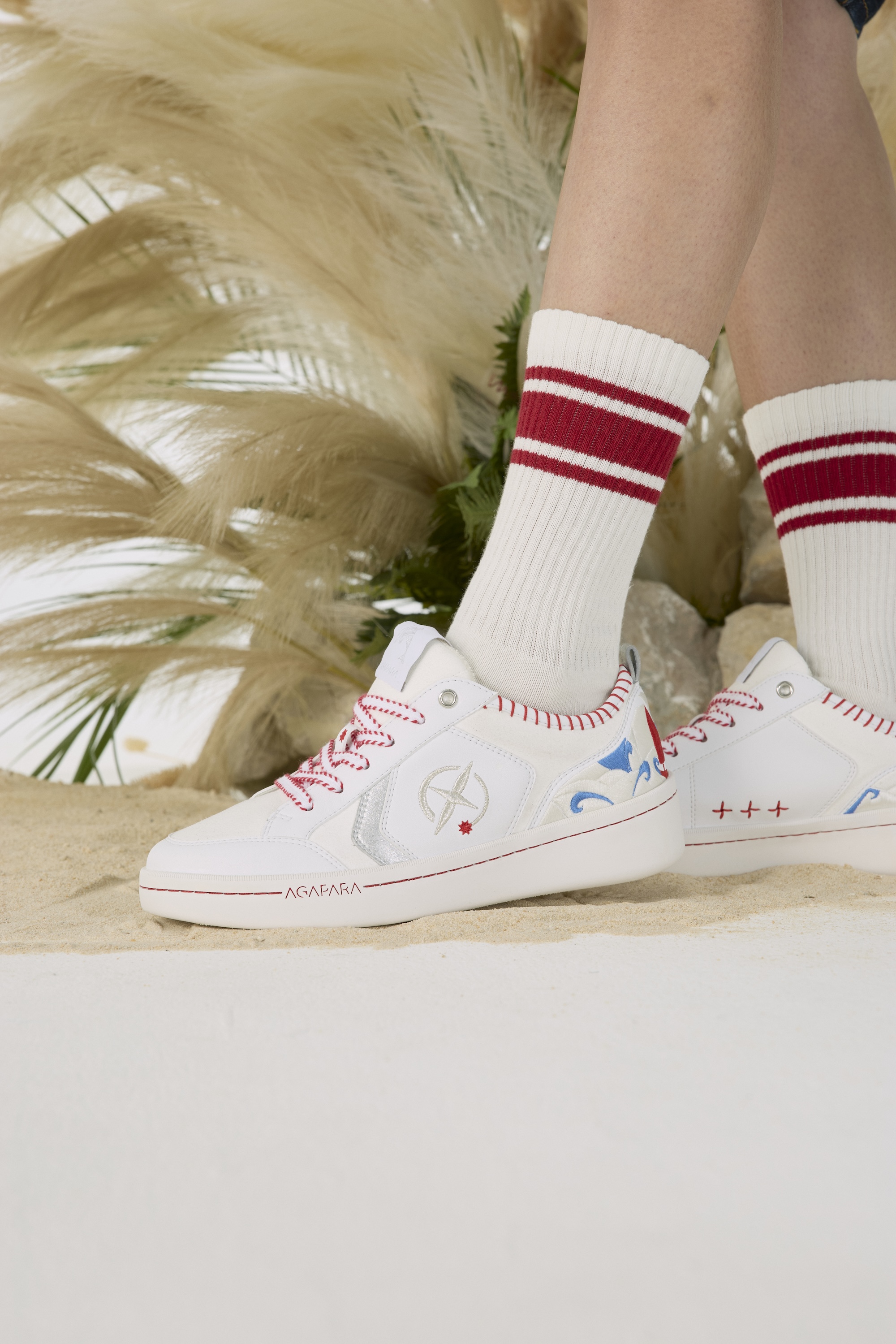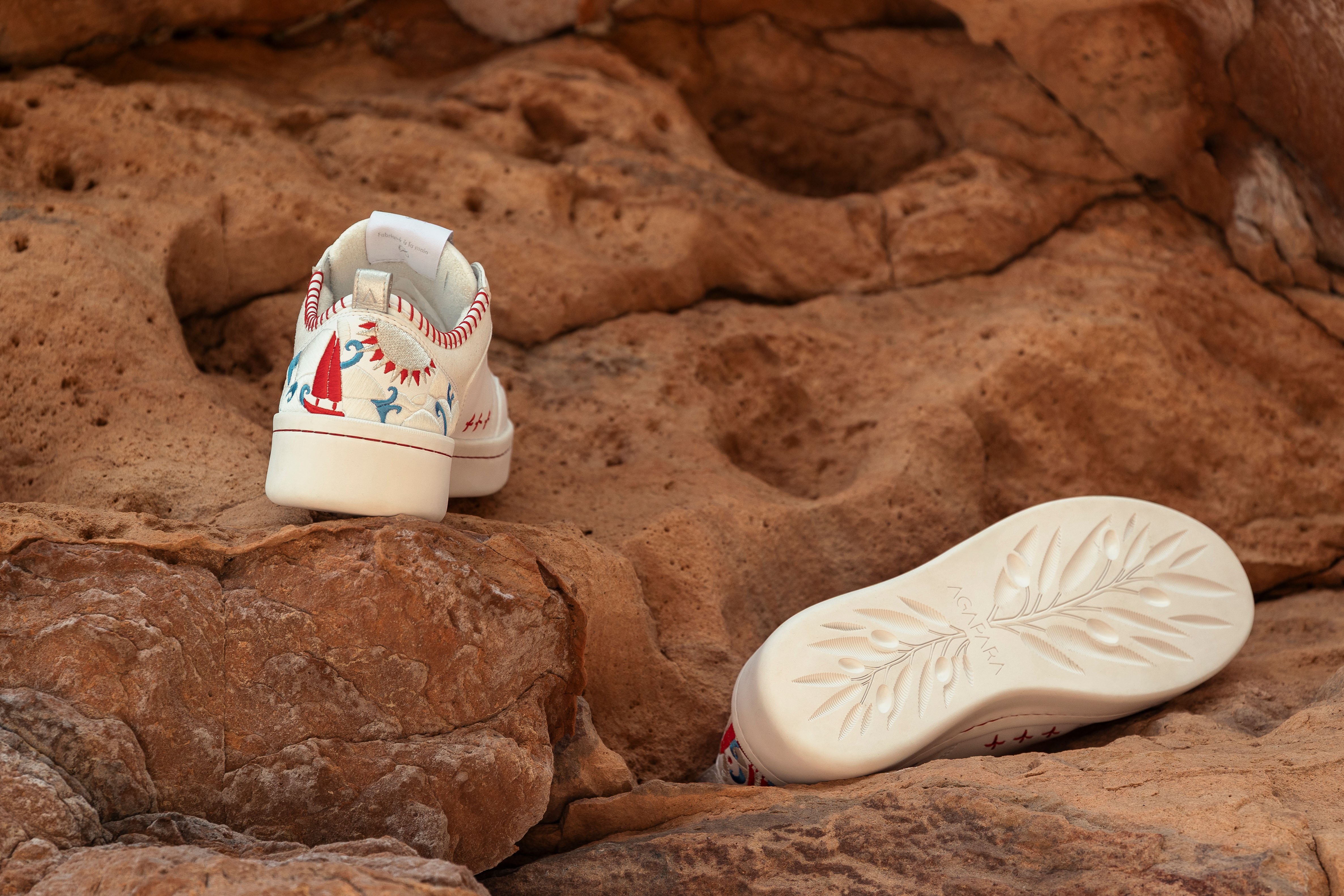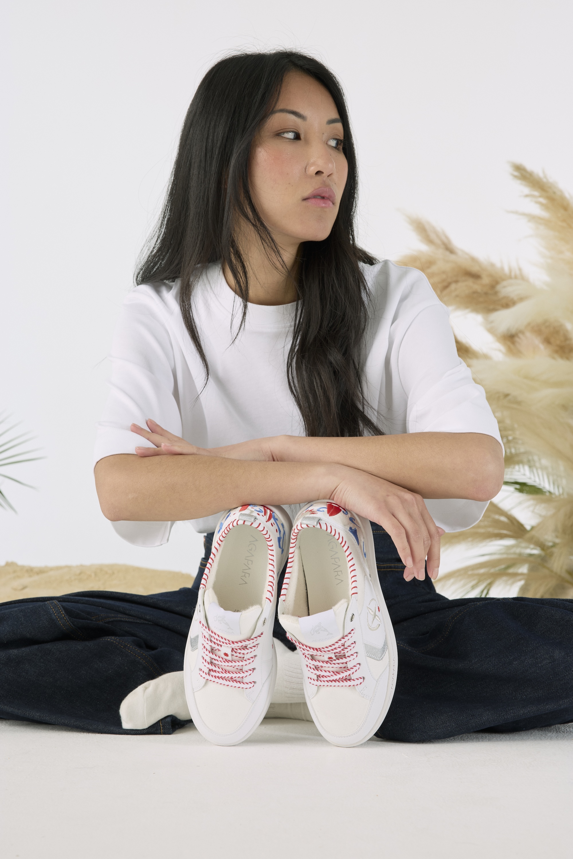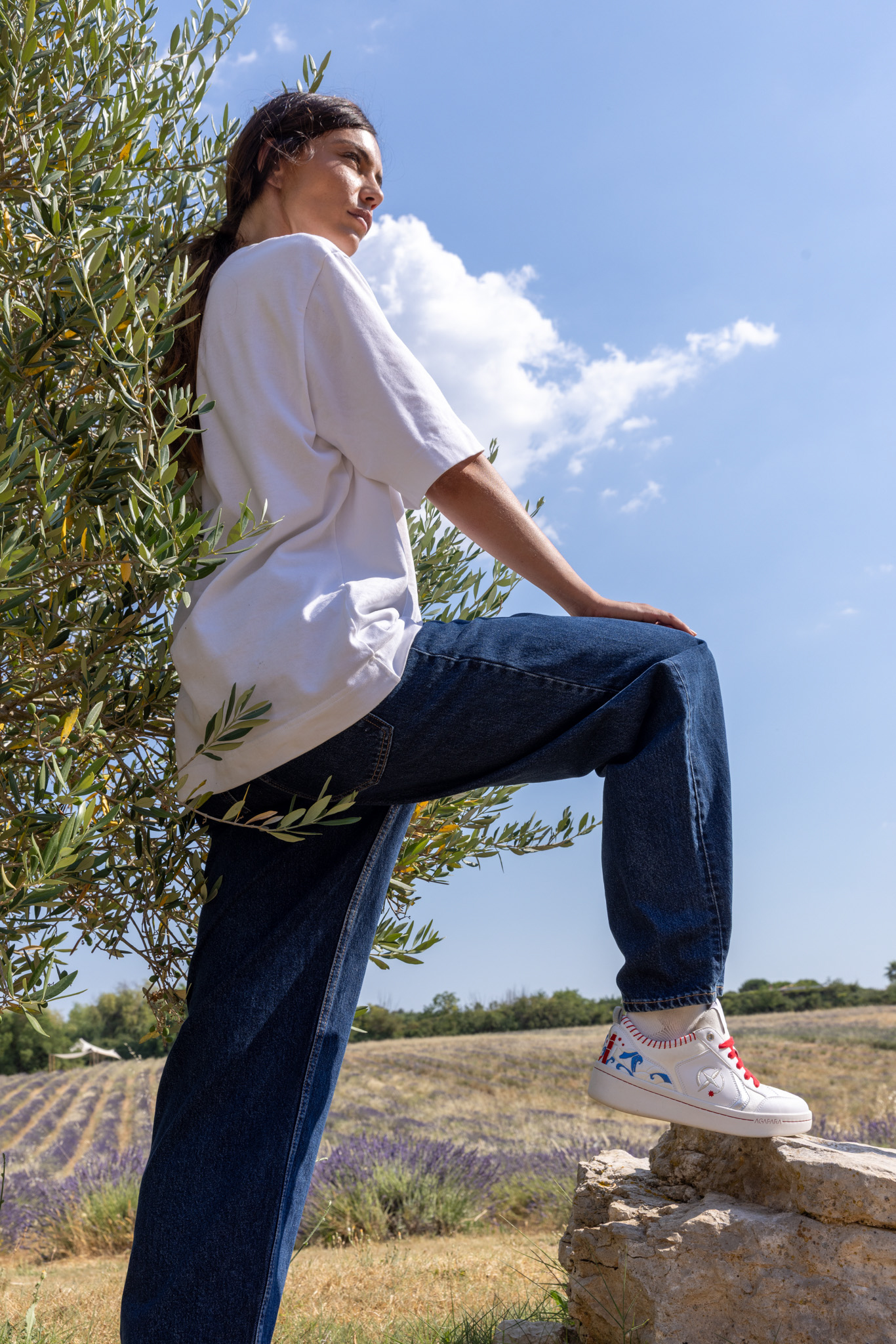 Sneaker artisanale inspirée par les voiles mythiques de Saint-Tropez. Réalisée avec 41 627 points de broderie, elle soutient la préservation des grands dauphins le long des côtes méditerranéennes françaises.